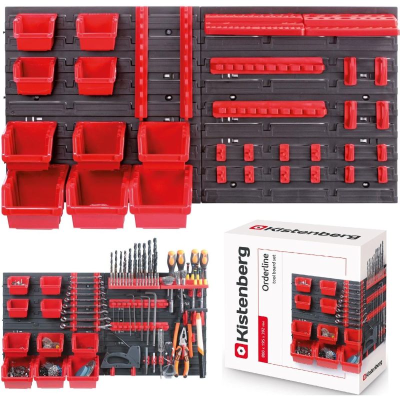 - Viele verschiedene Halter, Behälter und zwei Bretter ermöglichen es Ihnen, verschiedene Werkzeugtypen in der Werkstatt zu organisieren.