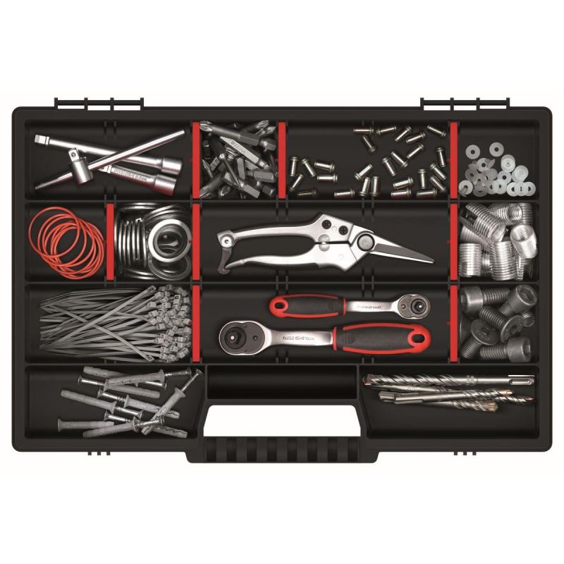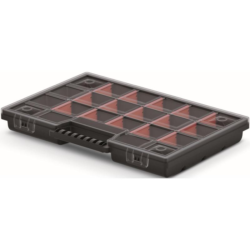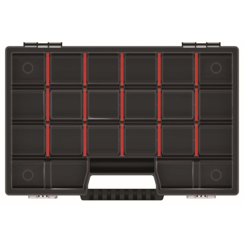 Der Organizer verfügt über 15 herausnehmbare Fächer, wodurch Sie Größe und Anzahl der Fächer an Art und Größe der aufbewahrten Werkzeuge anpassen können. Dank des praktischen transparenten Deckels können Sie den Inhalt sehen, ohne den Deckel öffnen zu müssen.