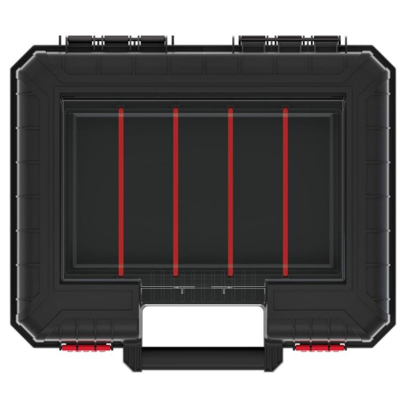 - Die transparente Organizer-Abdeckung aus robustem Polycarbonat ermöglicht einen schnellen Zugriff auf die Werkzeuge.
