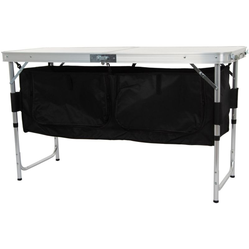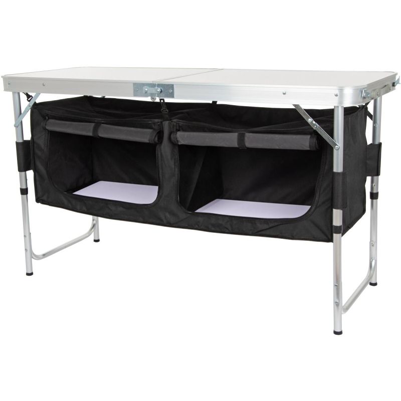 Der faltbare Campingtisch ENERO CAMP ist ein unverzichtbares Accessoire für Campingausflüge, Urlaube und Angeltouren. Er eignet sich auch perfekt für kleine Balkone oder Picknicks am See, wenn die Kinder hungrig werden. Zusammengeklappt ist er platzsparend und dank des blitzschnellen Faltmechanismus jederzeit einsatzbereit. Der Tisch verfügt über ein Staufach mit Reißverschluss für diverse Utensilien, eine dreistufige Höhenverstellung und eine spezielle Sicherung gegen versehentliches Öffnen von Koffern. Dank der schnellen und einfachen Montage ist er in wenigen Minuten aufgebaut und auf Ihre individuelle Höhe eingestellt. Das Tischgestell aus robustem und langlebigem Rohr trägt bis zu 30 kg, inklusive des Inhalts im Staufach.