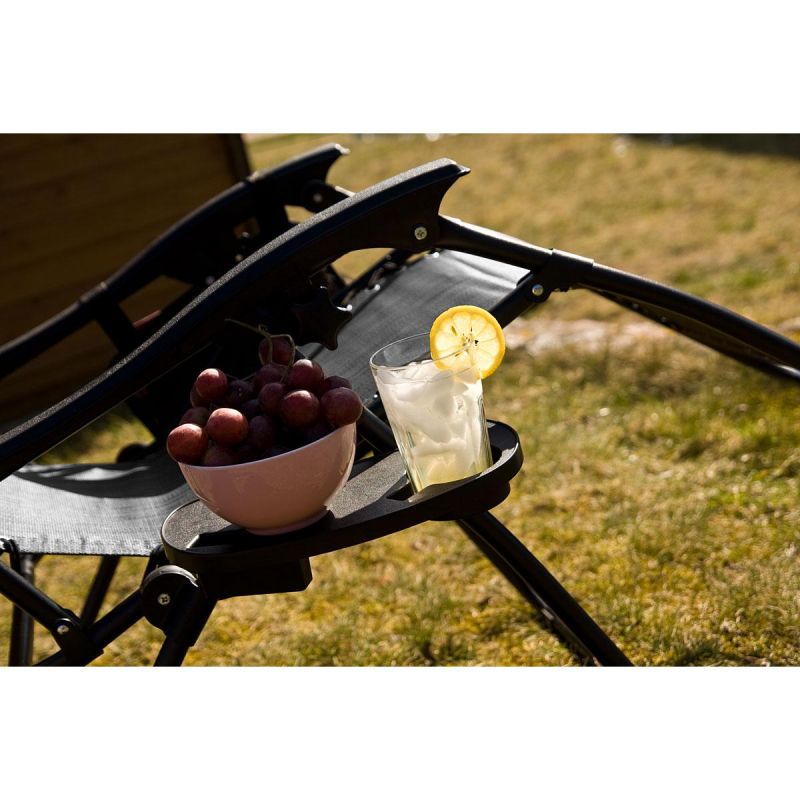 Die weiche Kopfstütze ermöglicht bequemes Anlehnen und eine komfortable Liegeposition. Das verstellbare Sonnendach spendet angenehmen Schatten oder lässt die Sonne ungestört scheinen, die Seitentasche bietet Platz für Zeitung oder Buch, und auf dem Tisch können Sie eine Tasse Kaffee, Saft oder Ihr Handy abstellen. Das Gestell des Stuhls besteht aus robustem und langlebigem Stahlrohr und trägt bis zu 120 kg!