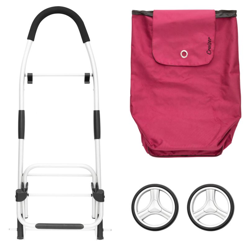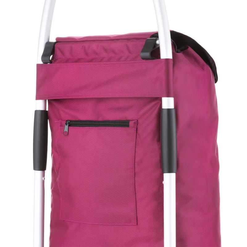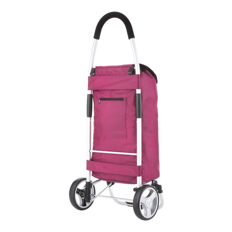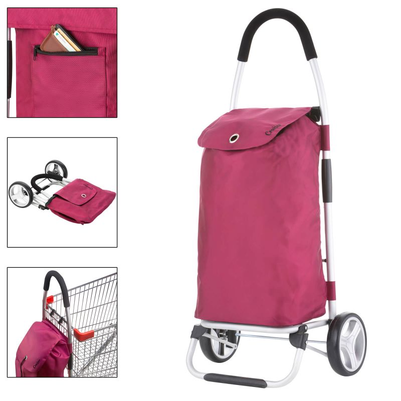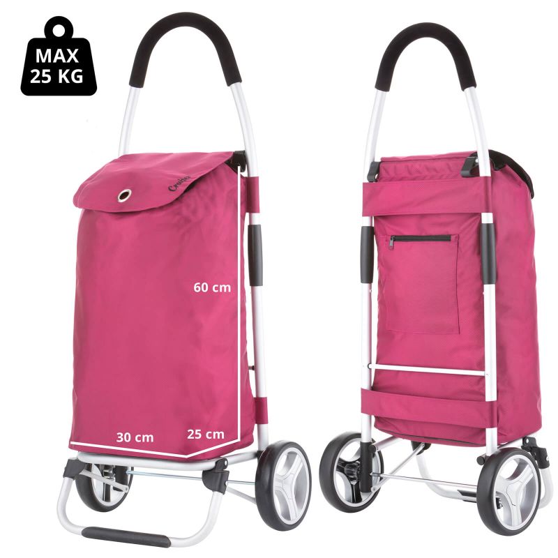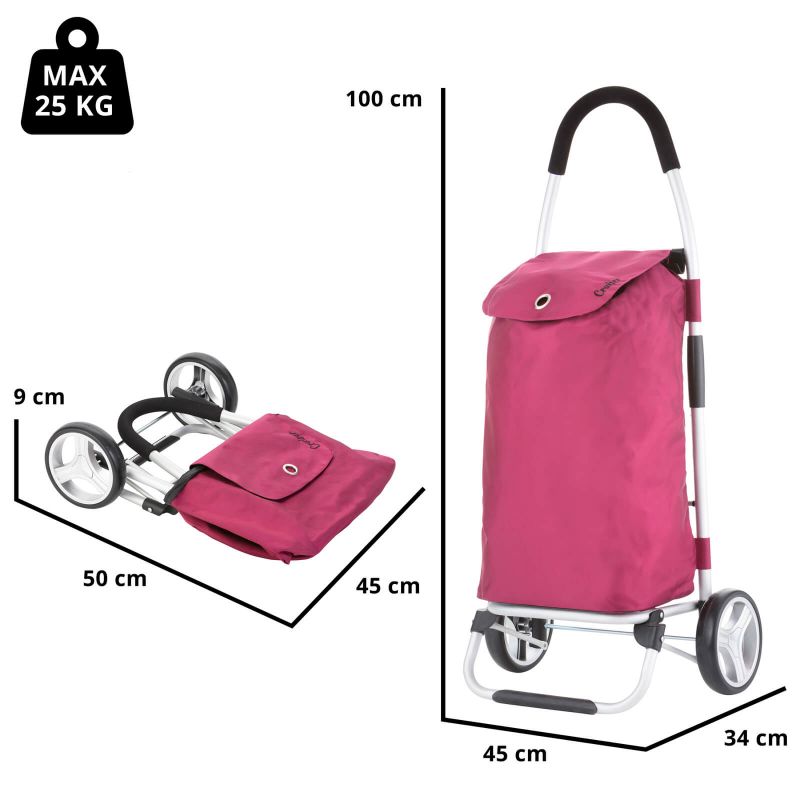Ein praktischer, leichter und geräumiger Einkaufswagen mit faltbarem Design. Er verfügt über ein geräumiges 40-Liter-Hauptfach mit Kordelzugverschluss und Klappe sowie eine zusätzliche Reißverschlusstasche auf der Rückseite. Ein verstärkter Boden, ein bequemer Griff, eine wasserdichte Konstruktion, große Räder für alle Oberflächen und ein schnelles und einfaches Falt- und Entfaltsystem sind seine Hauptvorteile.