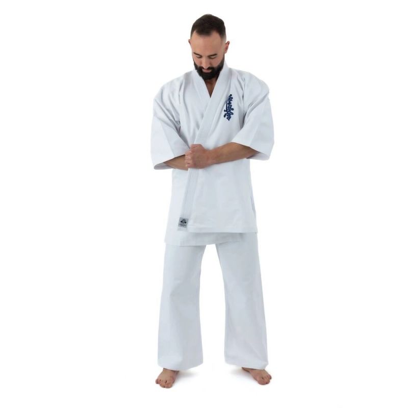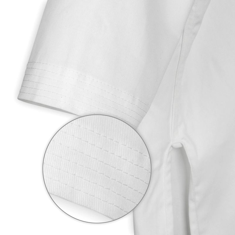 Hochwertiger Kyokushin-Karate-Kimono aus 100 % hochwertiger Baumwolle mit einem Gewicht von 280 g/m2, der eine lange Lebensdauer gegen Risse und Abrieb gewährleistet.