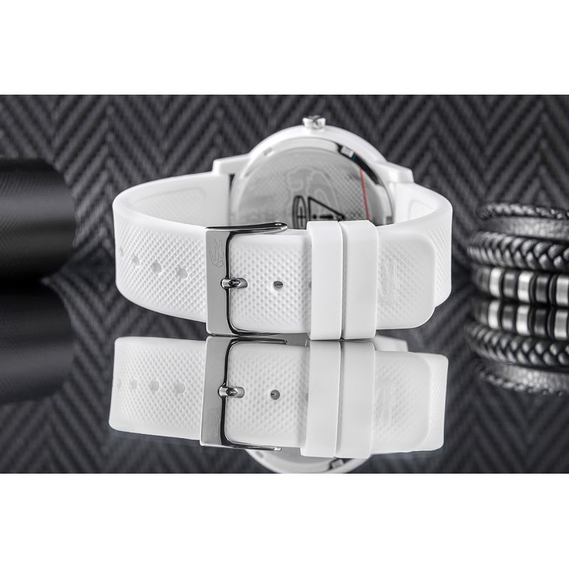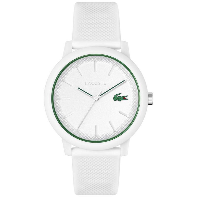 Dieses minimalistische weiße Modell ist perfekt für Männer, die Stil und Designeraccessoires schätzen. Das matte weiße Zifferblatt wird durch eine dezente Textur an den Rändern und kleine weiße Indizes veredelt, die der Uhr Tiefe verleihen, ohne von ihrer minimalistischen Ästhetik abzulenken. Ein besonderes Highlight ist das grüne Lacoste-Krokodil bei 3 Uhr, das einen frischen Akzent setzt und den sportlich-dynamischen Charakter der Marke unterstreicht. Der grüne Sekundenzeiger und die zarte grüne Lünette bilden einen perfekten Kontrast zum Weiß und verleihen der Uhr einen einzigartigen Look. Das Armband besteht aus leichtem, strapazierfähigem Silikon und ist am Ende mit einem Krokodilmotiv versehen.