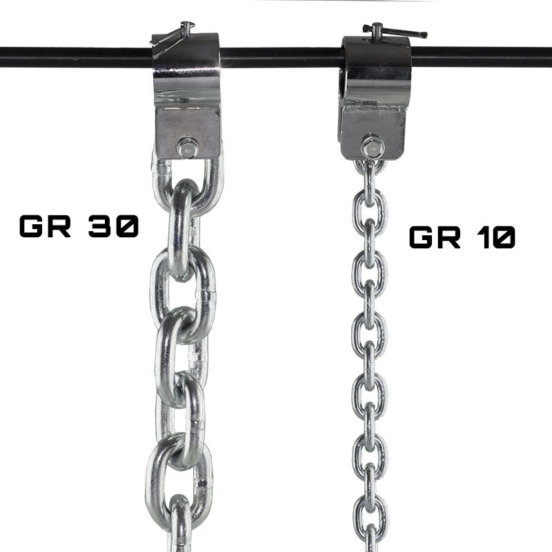 GR30 HMS – zwei langlebige Ketten zum Aufhängen an einer Langhantel. Das Produkt besteht aus hochwertigem Stahl. Dieses langlebige Material ist äußerst widerstandsfähig gegen Umwelteinflüsse.