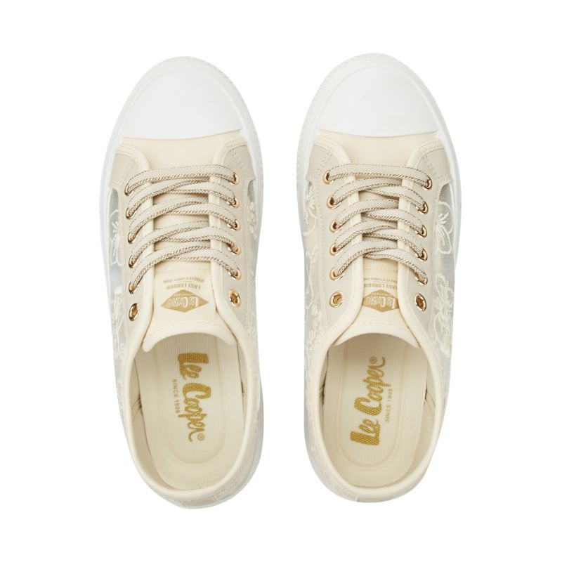 Die beigen Damenschuhe von Lee Cooper (LCW-26-44-4481LA) eignen sich perfekt für den Alltag. Das Obermaterial besteht aus Textil und Synthetik. Weitere Merkmale sind Schnüreinsätze, eine klassische Schnürung mit Metallösen, ein Textilfutter, eine weiche Innensohle und eine griffige Gummisohle.