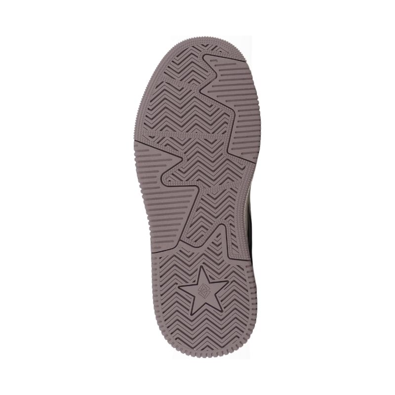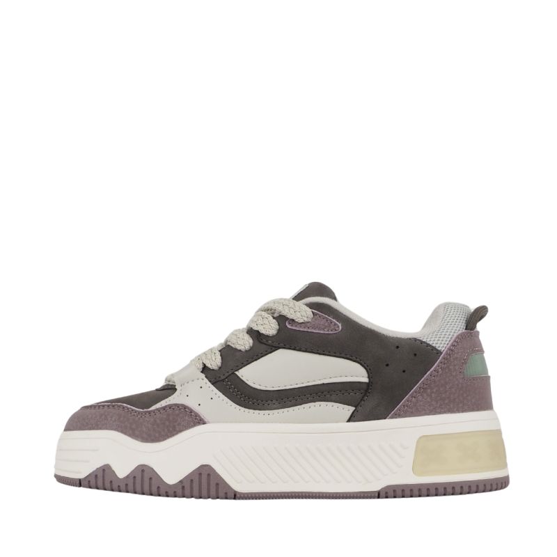 Das Obermaterial kombiniert verschiedene Strukturen, darunter Nubuk-imitierendes Öko-Leder, Kunstleder und Stoffeinsätze.