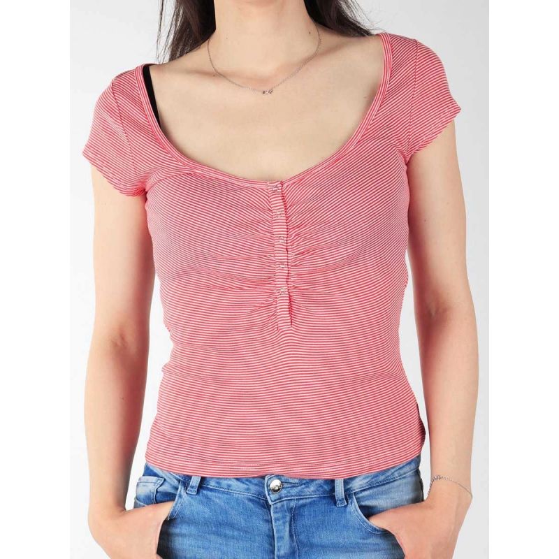 Damen-T-Shirt mit horizontalen Streifen. Kurze Ärmel. Das Shirt verfügt über eine geraffte Knopfleiste.