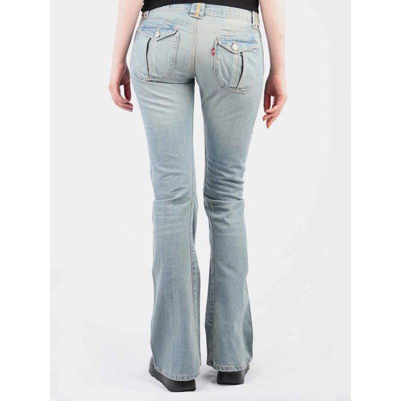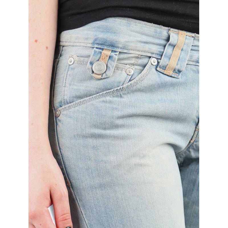 Damenjeans mit niedriger Leibhöhe und weitem Bein, Reißverschluss und Knopfverschluss.