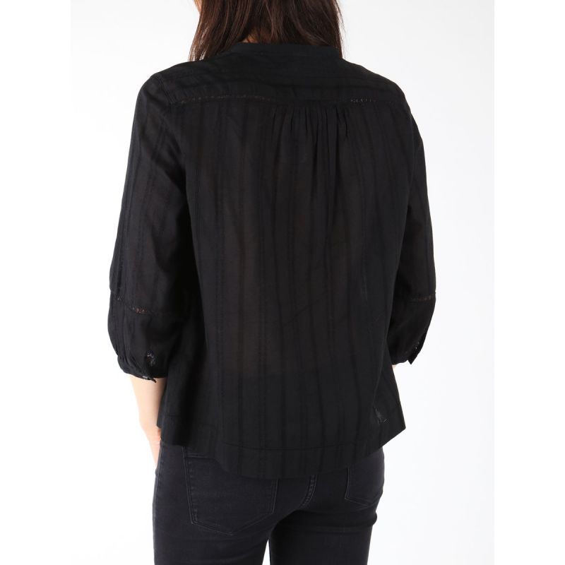 Damenhemd mit Stehkragen und langen Ärmeln. Das Hemd hat dekorative Einsätze und 5 Knöpfe auf der Vorderseite. Material: 100% Baumwolle