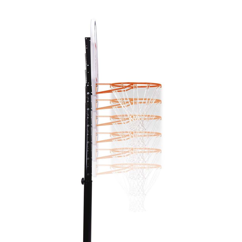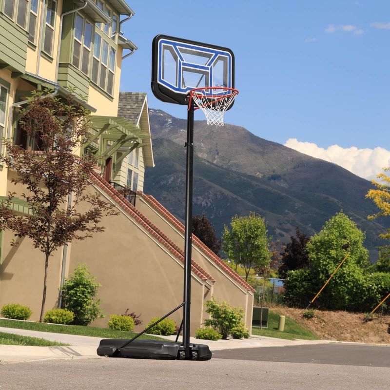 Dieser tragbare Basketballständer verfügt über ein 44-Zoll-Backboard mit bruchsicherer Stahlrahmentechnologie. Die bruchsichere Technologie garantiert dank einer Beschichtung aus hochwertigem Makrolon®-Polycarbonat lange Haltbarkeit und Stoßfestigkeit. Der Stahlrahmen ist ein robuster Stahlrahmen. Die teleskopische Höhenverstellung ermöglicht eine schnelle und einfache Anpassung an verschiedene Höhen von 228 bis 304 cm und gewährleistet so komfortables und sicheres Spielen auf jedem Fähigkeitsniveau. Das Set wird durch einen robusten Ring mit einem wetterbeständigen Nylonnetz und einer runden Stange mit 6,9 cm Durchmesser ergänzt. Der 45-Liter-HDPE-Sockel, gefüllt mit Wasser oder Sand, sorgt für absolute Stabilität. Das perfekte Set für Basketballspieler mit Anfänger- und Mittelniveau.