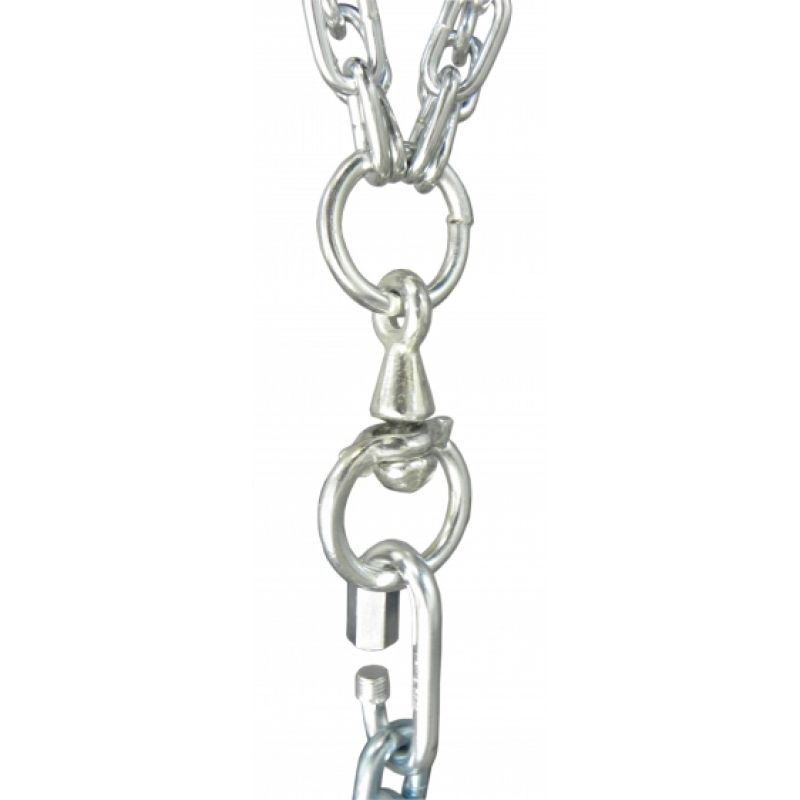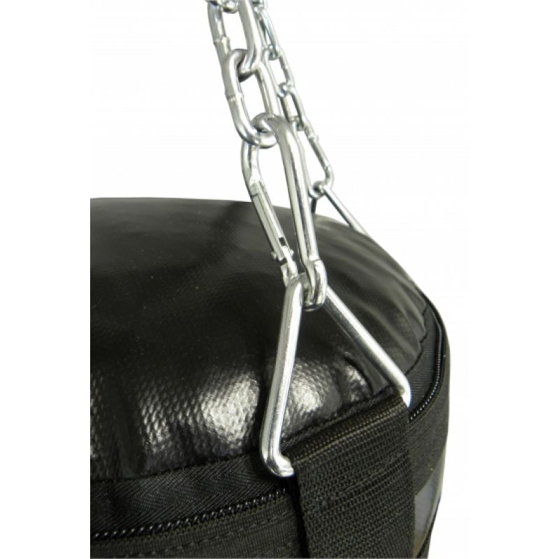 - Die Aufhängung erfolgt über vier Ketten, die mit Karabinerhaken an dreieckigen, an der Tasche angenähten Henkeln befestigt sind. Die Nähte werden zusätzlich durch einen stabilen Gurtbandkragen am oberen Rand der Tasche gesichert. Die Ketten sind durch eine Öse verbunden, an der ein Wirbel befestigt ist. Dank der Karabinerhaken können die Ketten ausgetauscht werden.