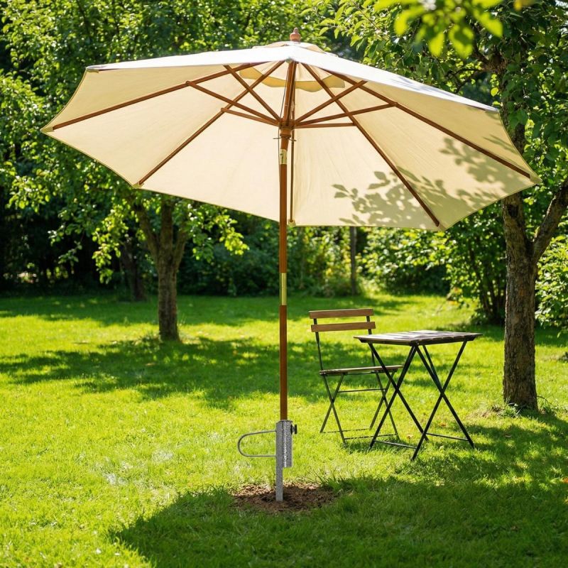 - Die Metallkonstruktion sorgt dafür, dass der Sonnenschirm fest im Boden verankert ist.