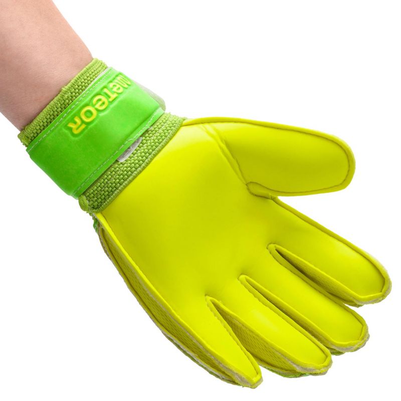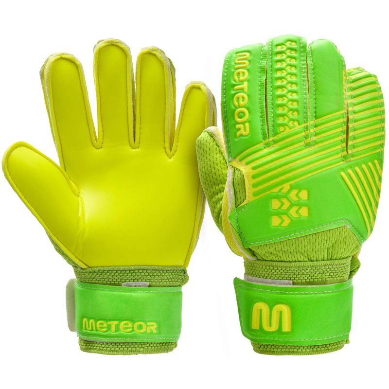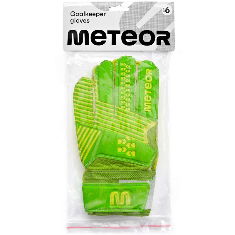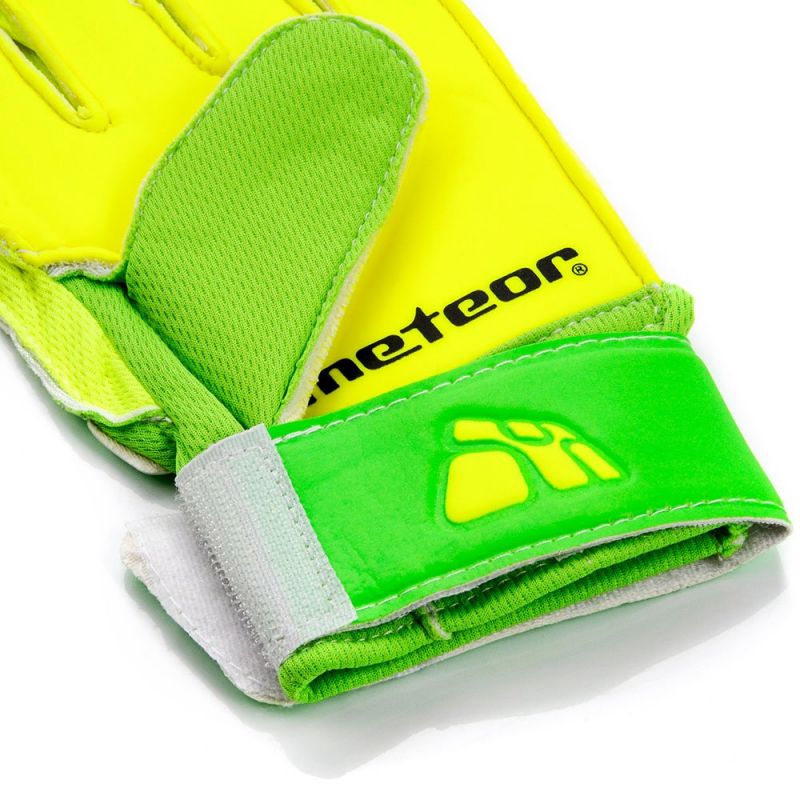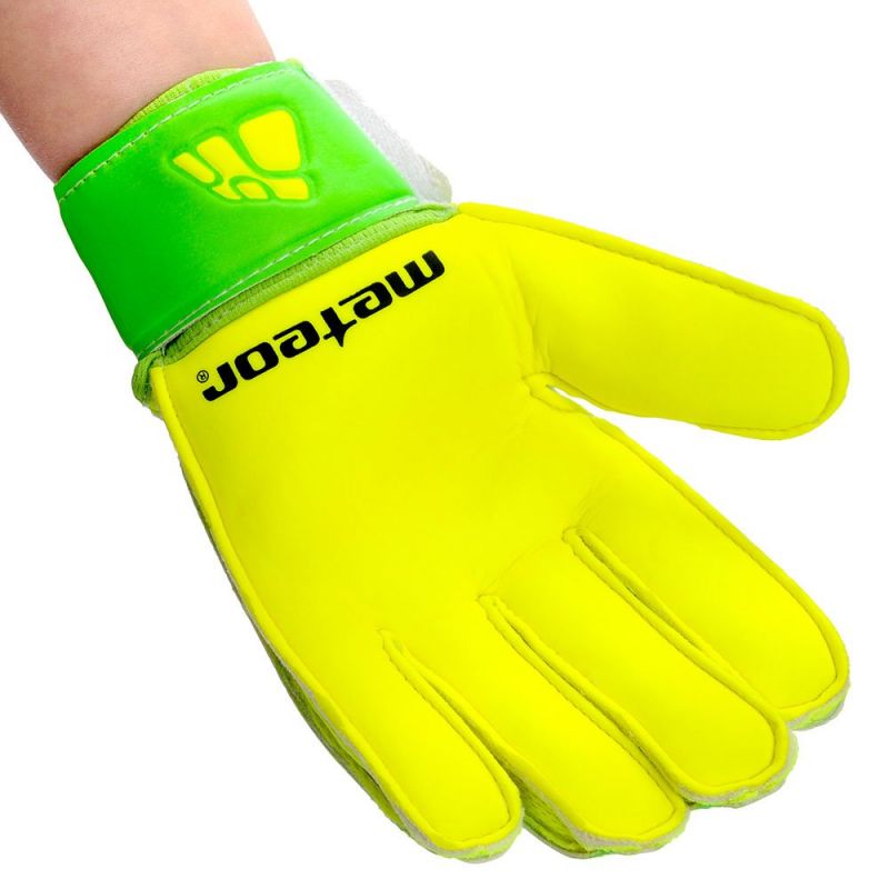 Meteor-Torwarthandschuhe sind für Training und Freizeitspiele konzipiert. Sie zeichnen sich durch hochwertige Verarbeitung, gute Stoßdämpfung und hohe Abriebfestigkeit aus. Sie wurden entwickelt und hergestellt, um die Handfläche des Torwarts beim Fangen von Bällen zu schützen. Sie bieten hervorragenden Grip, Rebound und Schlagkraft bei jedem Wetter. Eine zusätzliche Verstärkung, die als Schloss fungiert, schützt die Finger des Torwarts vor Verletzungen. Die Handschuhe verfügen über einen breiten Klettverschluss für zusätzliche Verstärkung.