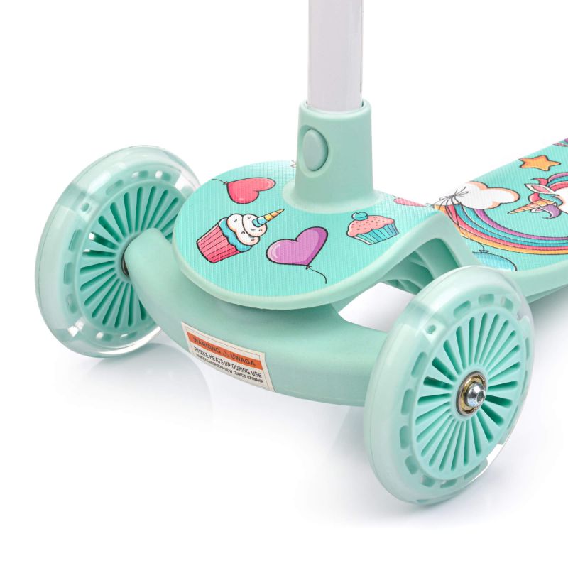 Sicheres Fahren – Das Dreirad-Design mit breitem Vorderradabstand erleichtert das Halten des Gleichgewichts und das Erlernen des Fahrens. Mit der Fußbremse am Hinterrad kann Ihr Kind den Roller schnell und effektiv anhalten, und die leuchtenden Räder verbessern die Sichtbarkeit auf der Straße und maximieren so die Sicherheit.