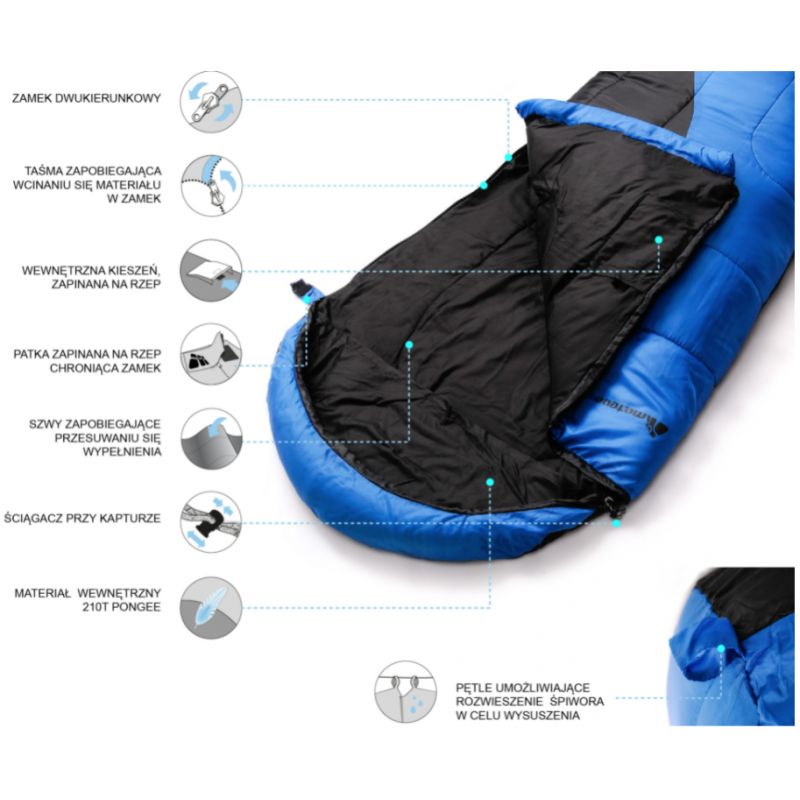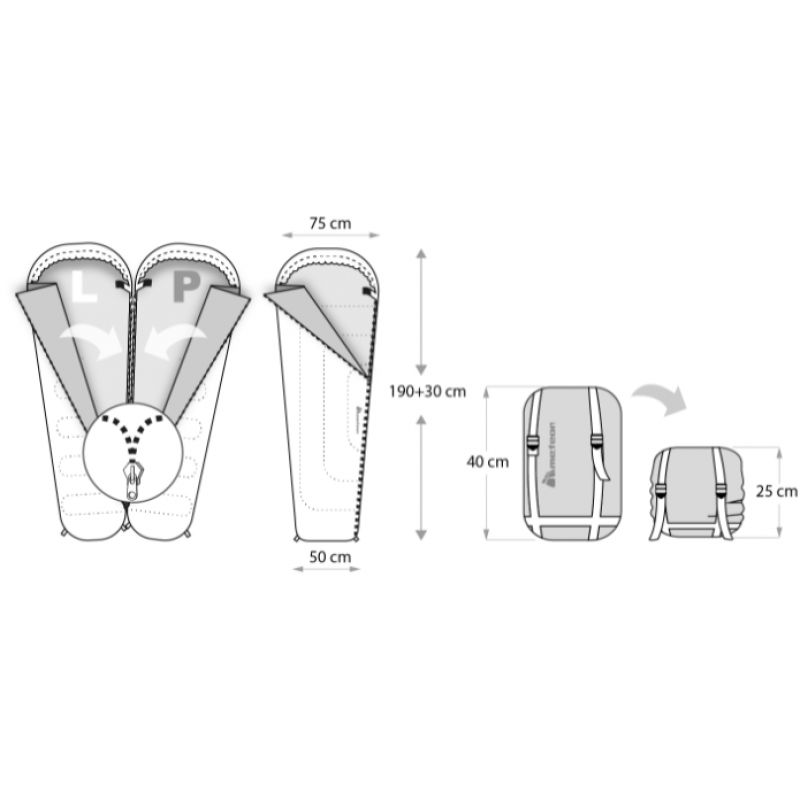 - Dieses Modell ist in zwei Varianten erhältlich: mit rechtsseitigem und linksseitigem Reißverschluss. Dadurch können die Schlafsäcke miteinander verbunden werden.