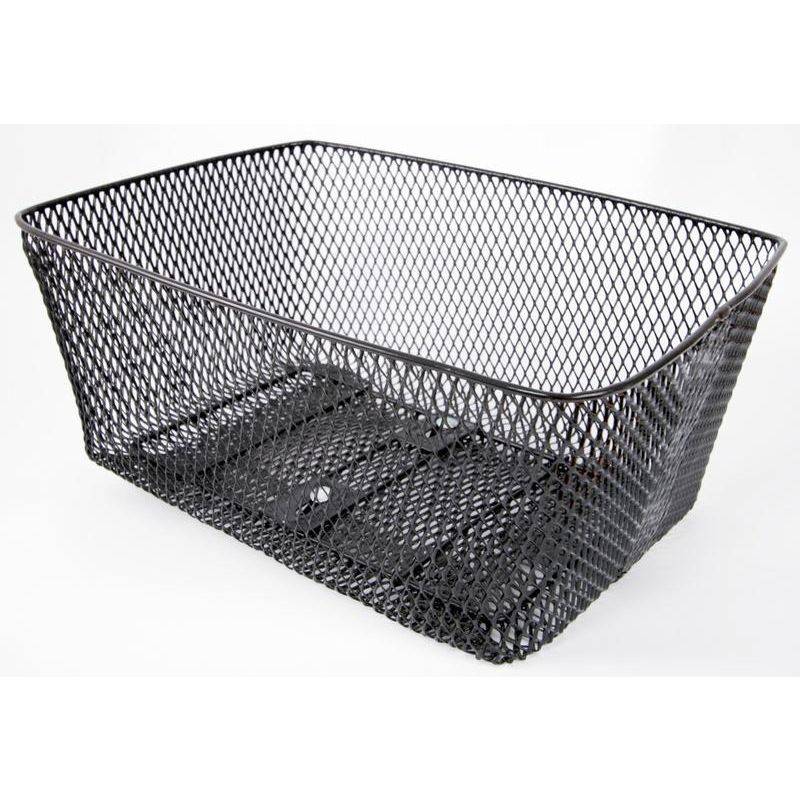 Fahrradkorb aus Drahtgeflecht, das an den Stamm geschraubt ist. schwarze Farbe