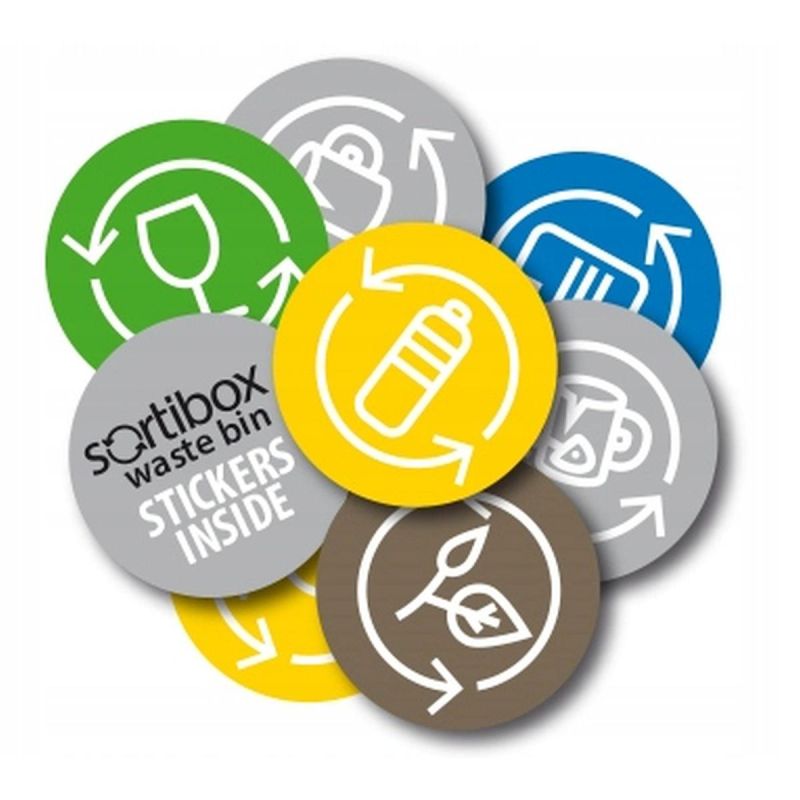 - Farbige Aufkleber auf den Behältern helfen dabei, die Art des gesammelten Abfalls zu kennzeichnen.