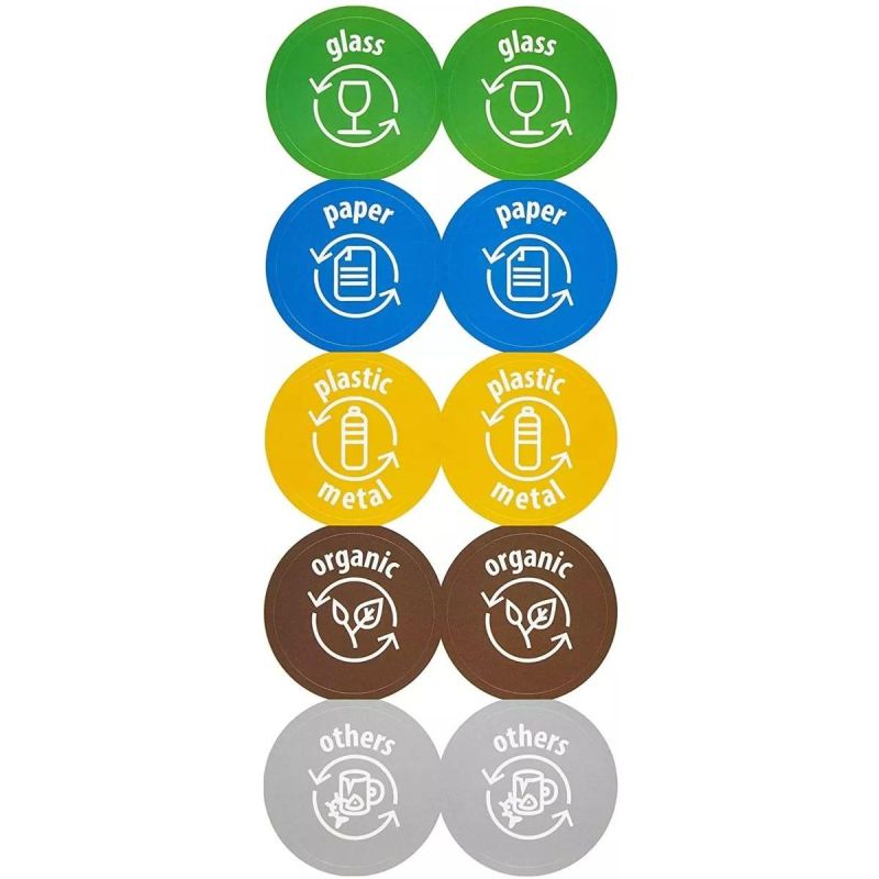 - Farbige Aufkleber auf den Behältern helfen dabei, die Art des gesammelten Abfalls zu kennzeichnen.