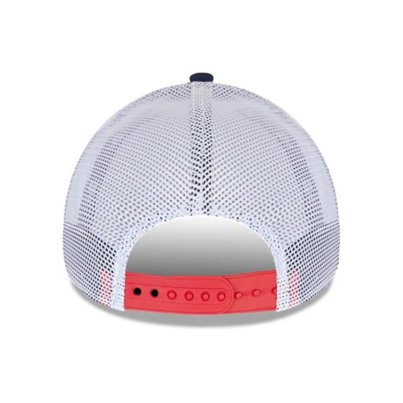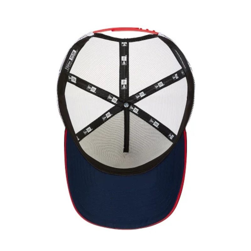 Die Kappe ist weiß und marineblau, ergänzt durch ausdrucksstarke rote Akzente, die dem Ganzen einen sportlichen und dynamischen Look verleihen.