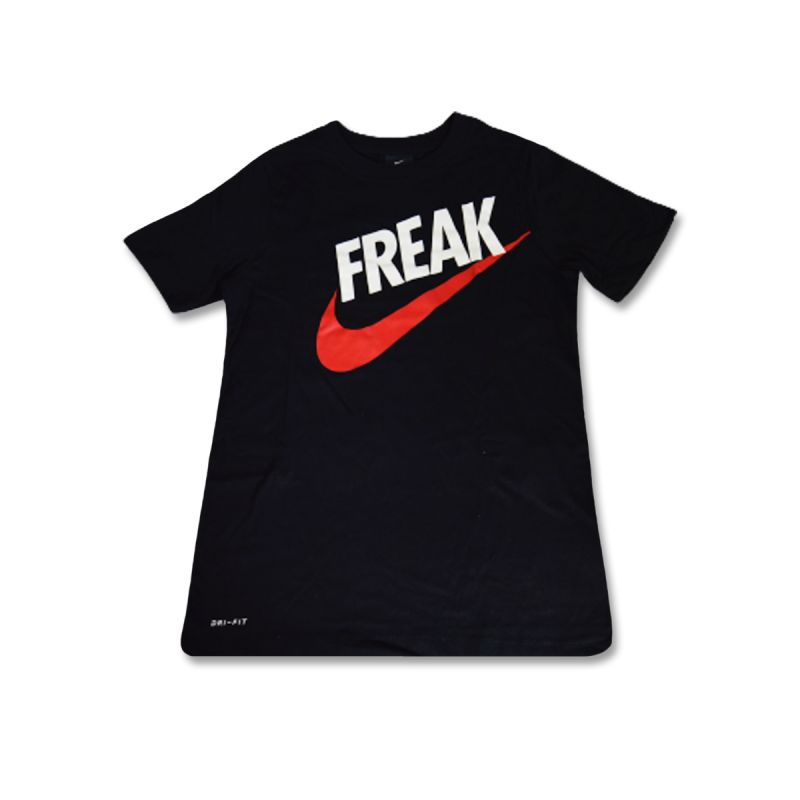 Das Produkt ist schwarz mit einem roten Nike-Logo auf der Brust und einem weißen Freak-Schriftzug.