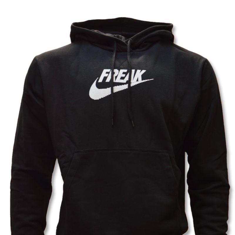 Ein klassisches schwarzes Sweatshirt mit einem weißen FreakSwoosh-Logo auf der Brust.