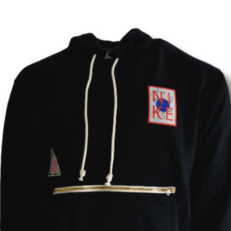 Schwarzes Sweatshirt mit bunten Aufnähern, die auf die Marke Nike verweisen.