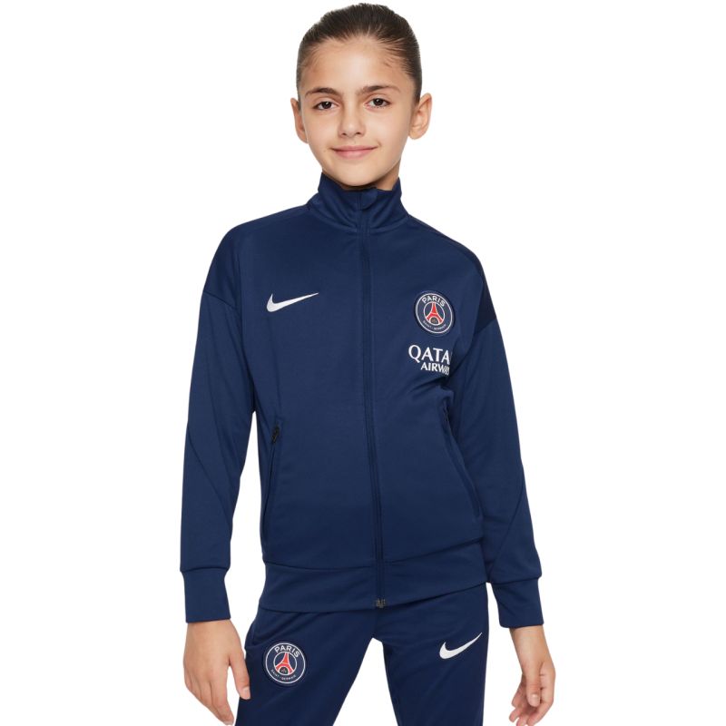 Nike PSG Dri-FIT Academy Pro Trainingsanzug für Kinder, Marineblau FQ0063 411. Dieser Trainingsanzug ist eine funktionelle Ergänzung für die Sportgarderobe jedes jungen Fans. Er trägt das Logo von Paris Saint-Germain. Die Dri-FIT-Technologie leitet Feuchtigkeit ab. Das Sweatshirt hat einen durchgehenden Reißverschluss und Reißverschlusstaschen. Die Trainingshose hat elastische Bündchen. Der elastische Bund ist mit einem Kordelzug verstellbar. Material: 100 % Polyester