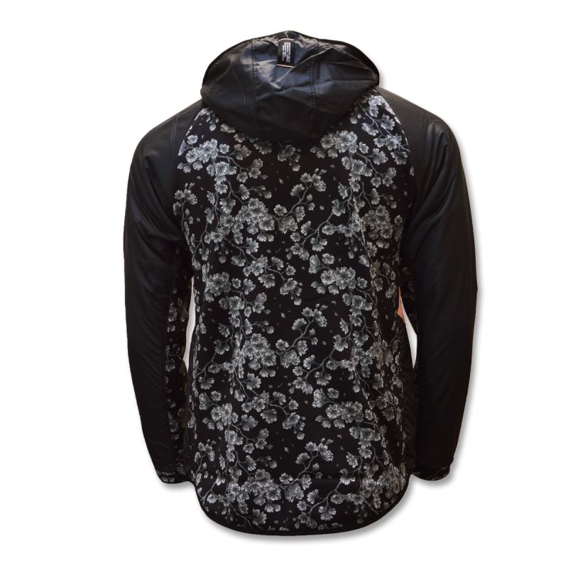 Das Modell besteht größtenteils aus recyceltem Polyester und ist schwarz mit einem floralen Muster auf Vorder- und Rückseite.