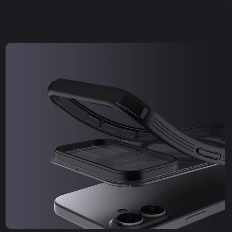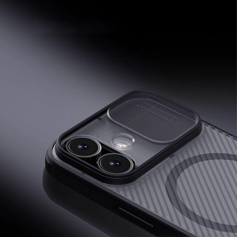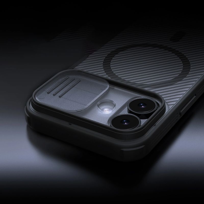 Das Nillkin CamShield Pro Case ist eine magnetische Schutzhülle für das iPhone 17. Ein integrierter Magnetring ermöglicht bequemes kabelloses Laden und die Verwendung von MagSafe-kompatiblem Zubehör, ohne die Hülle entfernen zu müssen. Die Konstruktion aus zwei Materialien – robustem Polycarbonat und flexiblem TPU – erhöht die Stoß- und Fallfestigkeit des Smartphones. Die transparente schwarze Oberfläche bewahrt das Design des Geräts und verleiht ihm gleichzeitig einen modernen, technischen Look.