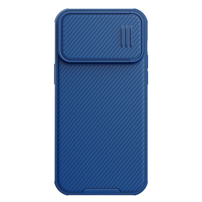 Gepanzerte iPhone 14 Pro Max-Hülle aus der Nillkin CamShield S Case- Serie mit blauer Kameraabdeckung