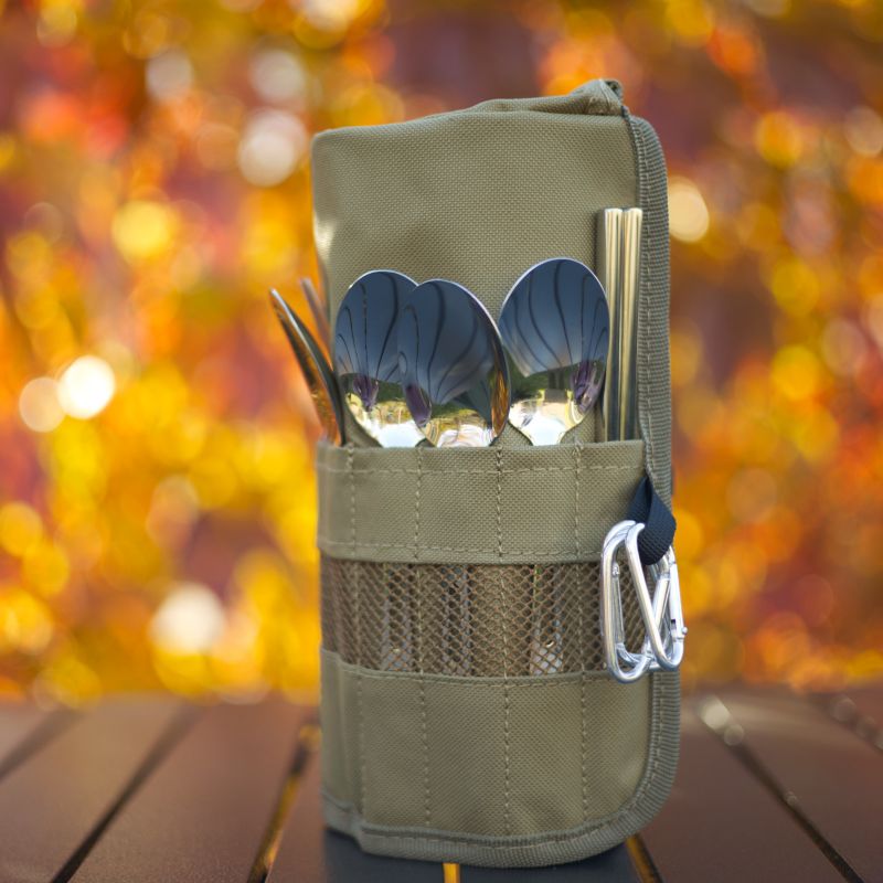 Das Set beinhaltet: 4 Löffel, 4 Gabeln, 4 Messer, ein Set Essstäbchen, 3 Karabinerhaken