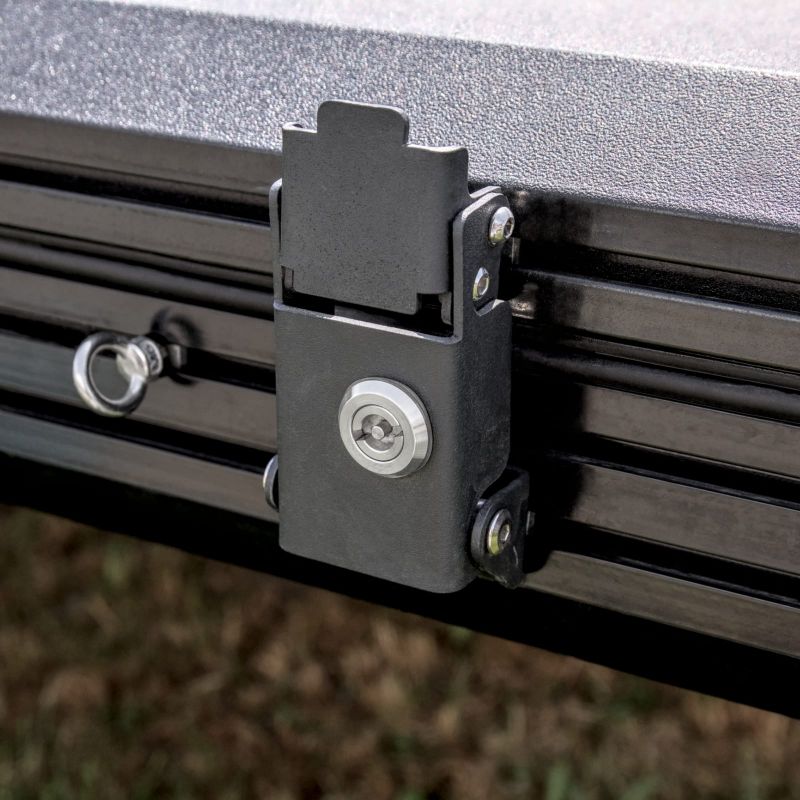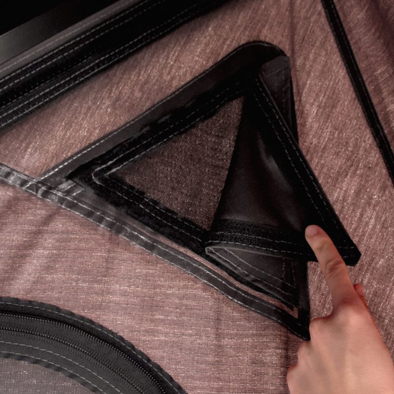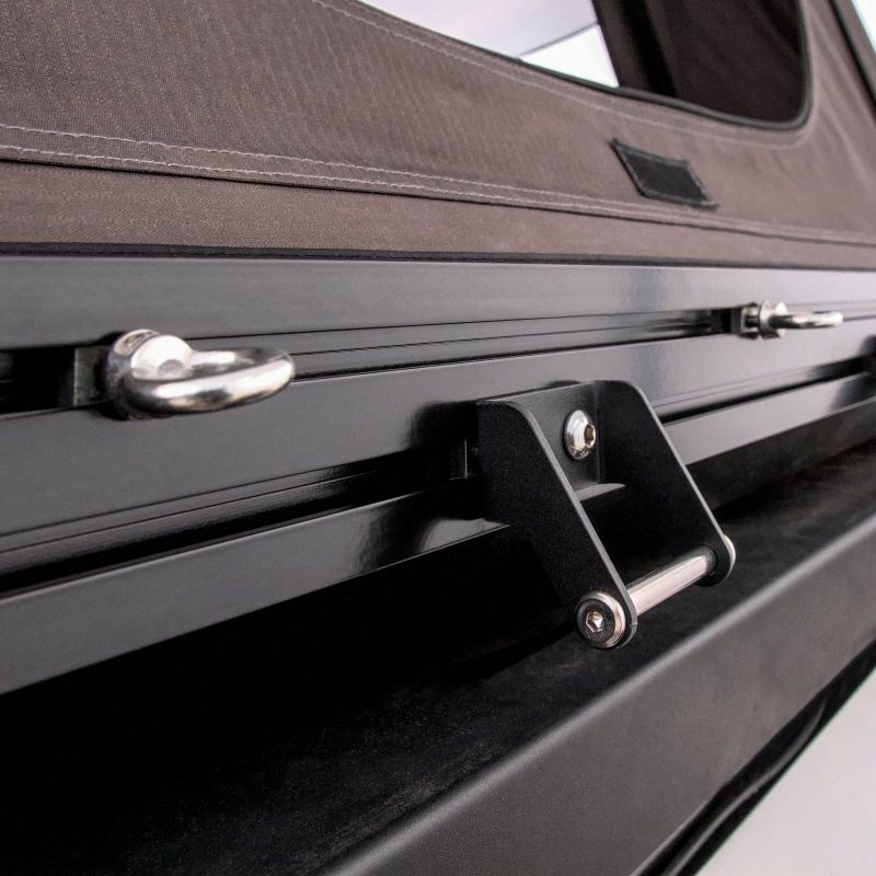 Zubehör: Teleskopleiter, Schuhtasche, Zubehörtaschen, LED-Beleuchtung zum Anschluss an eine Powerbank, Abdeckung für geschlossenes Zelt, Antikondensationsmatte, Stangen für zusätzliches Gepäck (am Zelt montiert), zusätzliche T-SLOT-Befestigungsschrauben, Griff zum Schließen des Zeltes.