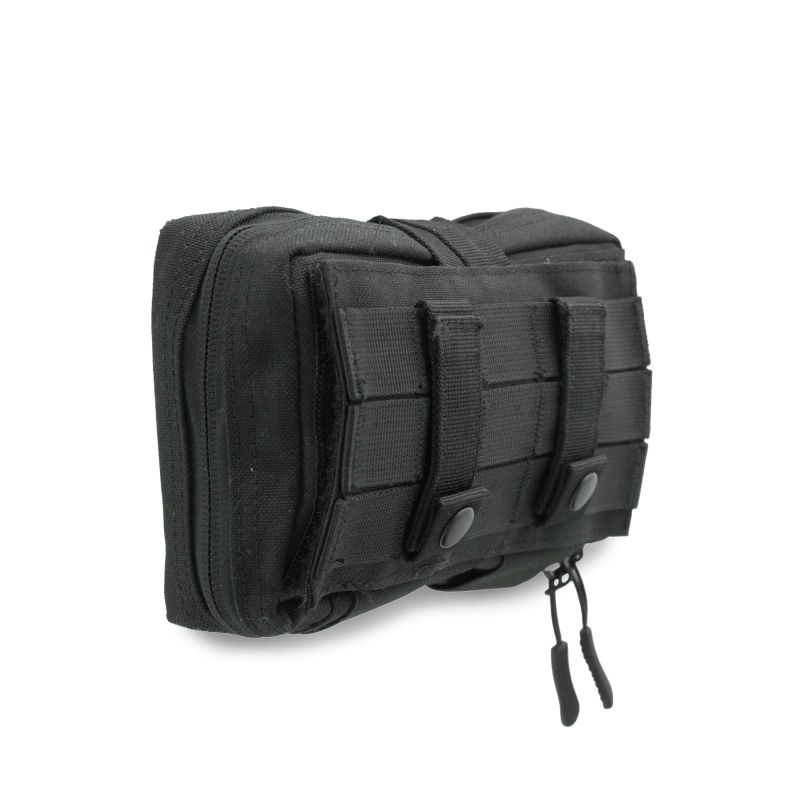 - Auf der Rückseite der Tasche befindet sich eine abnehmbare Klettverschlussplatte, die auch PALS-Gurte (Pouch Attachment Ladder System) mit Druckknöpfen enthält, mit denen das Erste-Hilfe-Set an einem Gürtel, einer taktischen Weste oder einem Rucksack befestigt werden kann.