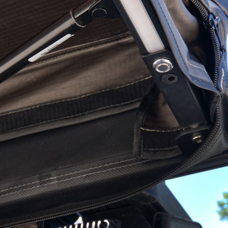 Zum Set gehört außerdem ein Einschub-Organizer, der in eine Schiene unter dem Markisendach passt. Darin lassen sich kleine Accessoires, Werkzeuge oder andere wichtige Dinge bequem verstauen – alles, was Sie griffbereit in Reichweite der Markise haben müssen. Diese praktische Lösung vereinfacht die Organisation im Camp und verhindert Unordnung.