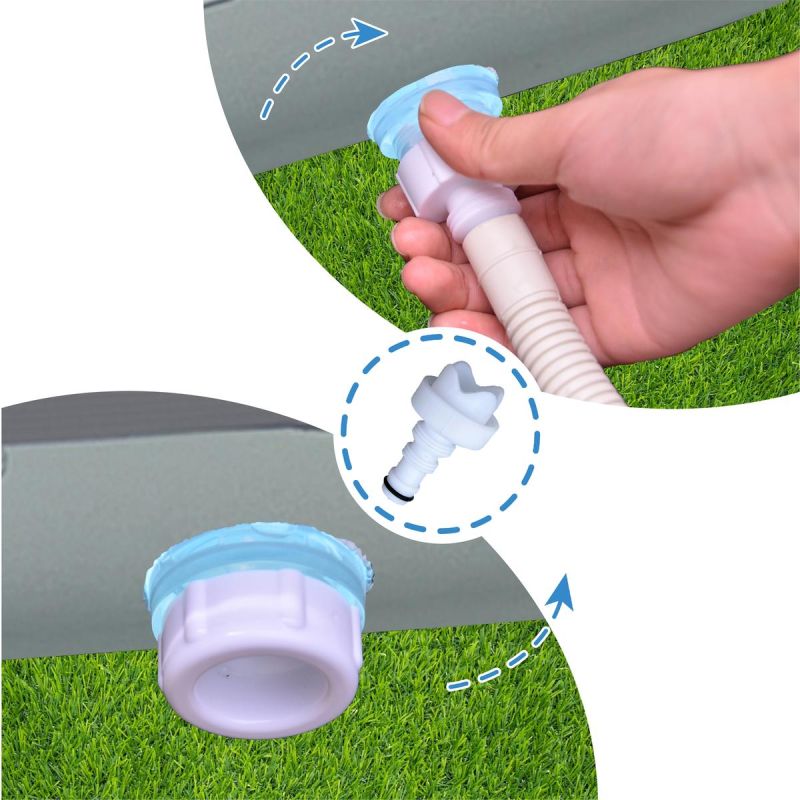 Der Pool verfügt über Anschlüsse mit 32 mm Durchmesser, die den Anschluss handelsüblicher Filterpumpen und Sandfiltersysteme ermöglichen. Dies gewährleistet eine konstante Wasserzirkulation und einwandfreie Wasserreinheit während der gesamten Lebensdauer.