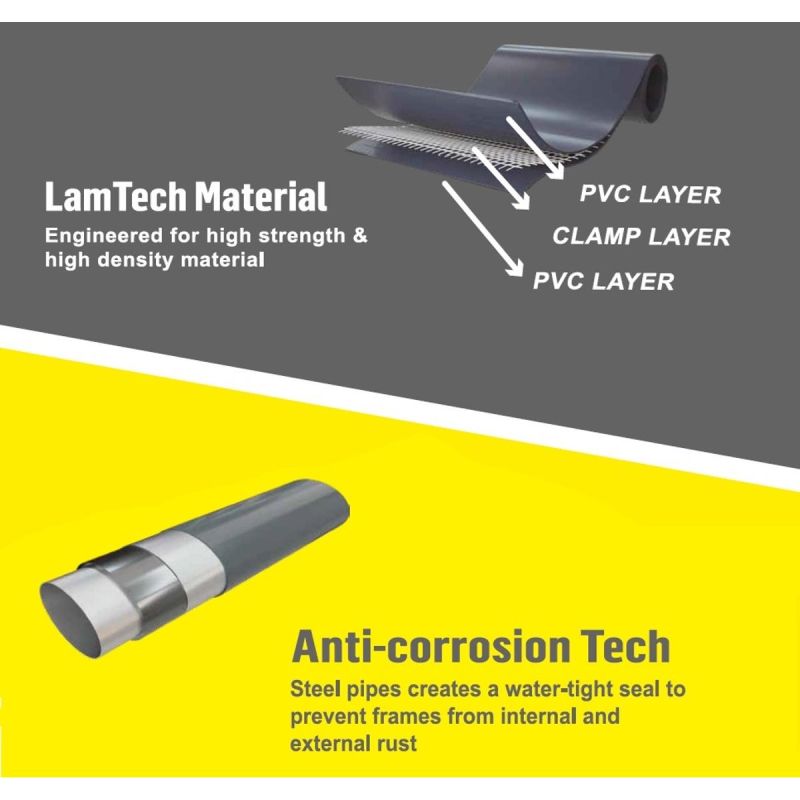 - Die Poolbeschichtung besteht aus dreifach laminiertem PVC mit hoher Festigkeit und Dichte, was eine lange Lebensdauer gewährleistet.