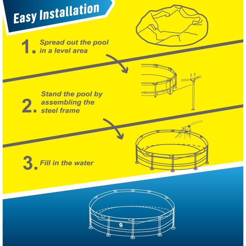 Der Pool lässt sich kinderleicht aufbauen und benötigt kein Spezialwerkzeug. Der Stahlrahmen und die Pfosten ergeben im Handumdrehen eine stabile Konstruktion, die Sicherheit und Benutzerfreundlichkeit gewährleistet. Sofort kann er mit Wasser befüllt werden!