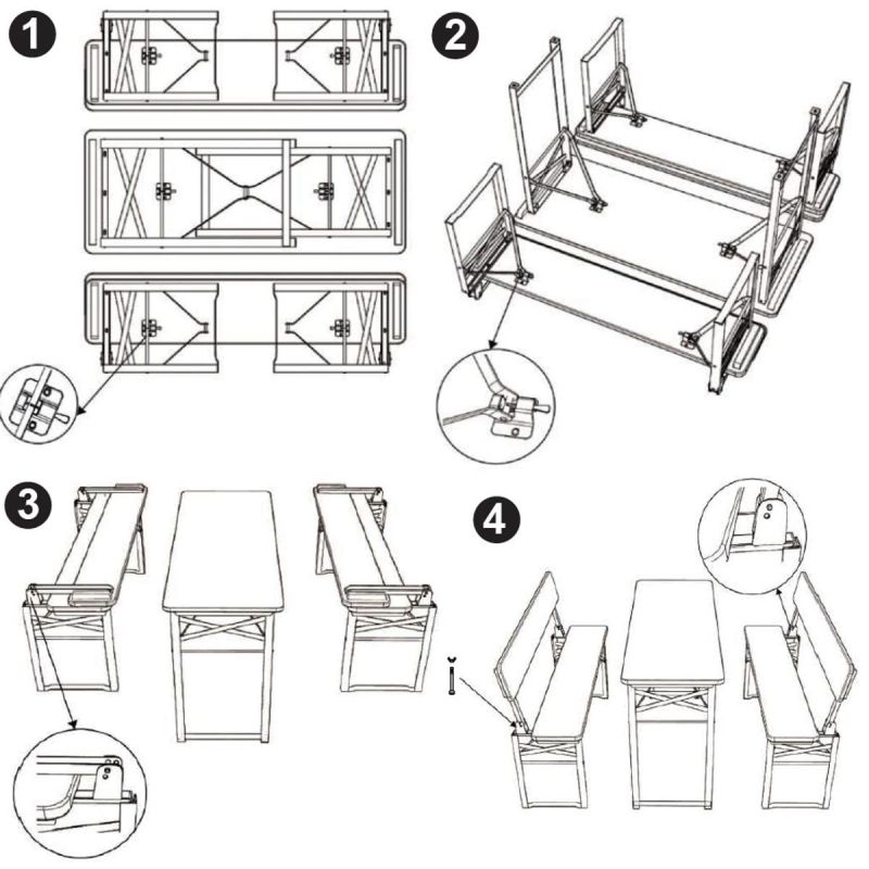 Das gesamte Set, bestehend aus einem Tisch und zwei Bänken, ist so konzipiert, dass es zusammengeklappt minimalen Platz benötigt und sich daher leicht verstauen und transportieren lässt. Spezielle Verriegelungen an den Gestellen sorgen zudem für Ihre Sicherheit während der Benutzung.