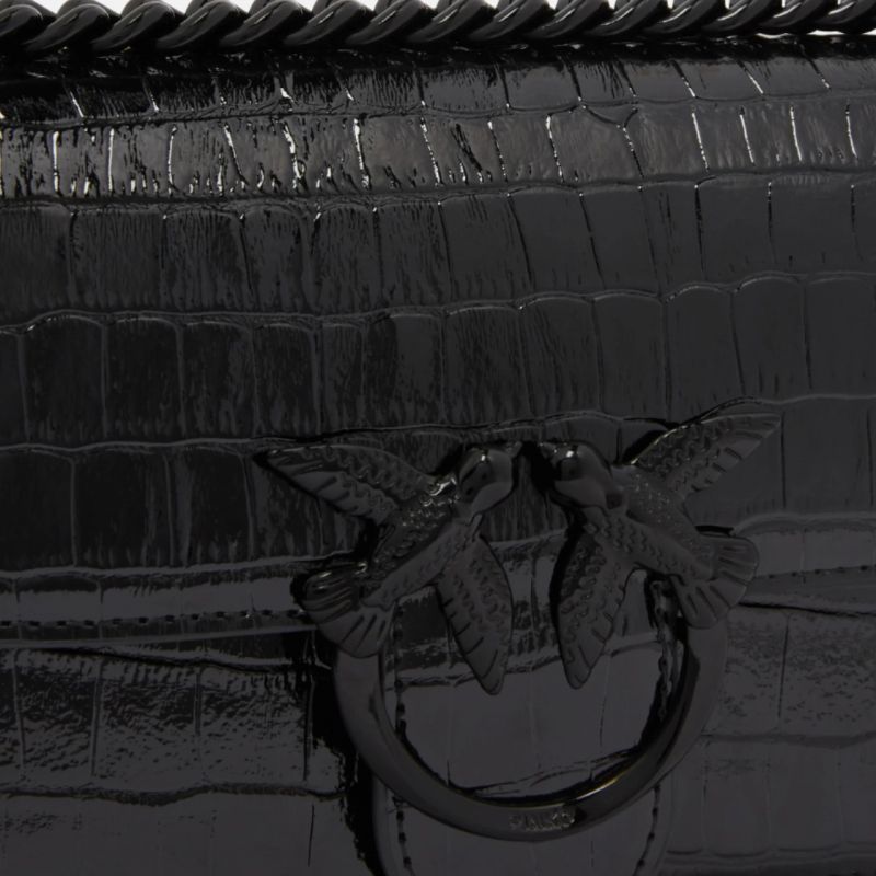 - Love One Mini Bag Umhängetasche aus echtem krokodilähnlichem Leder mit schwarzem Lackleder-Effekt-Finish.