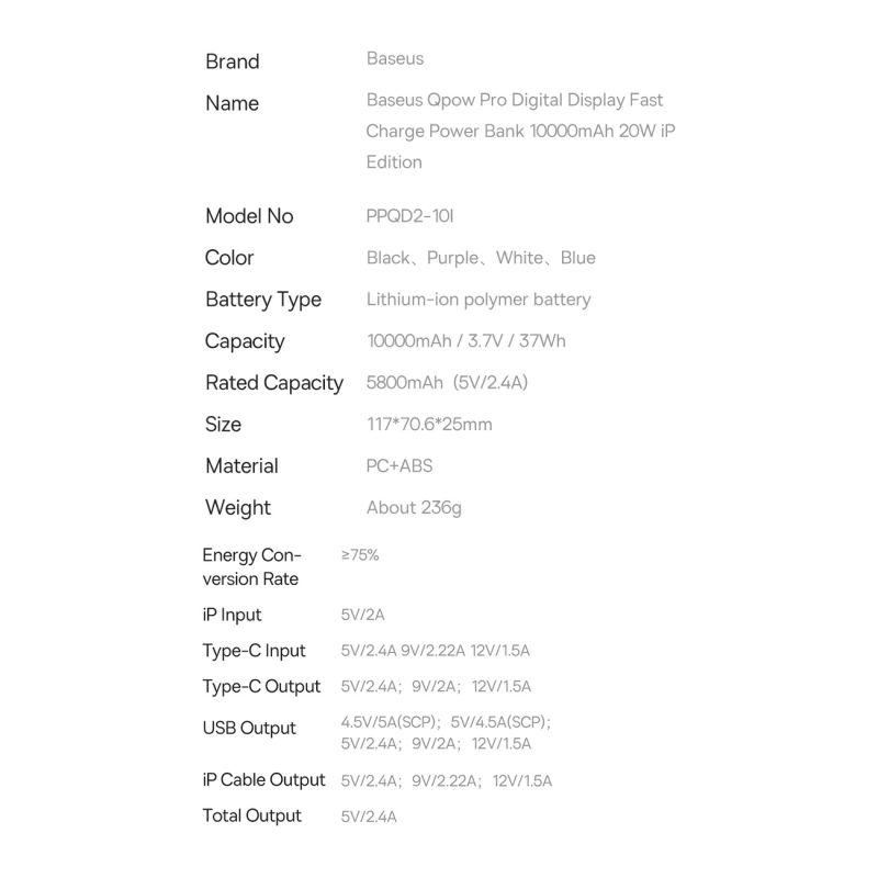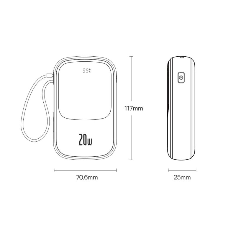 Besitzen Sie viele Geräte, die Sie täglich nutzen? Auf Reisen oder fernab einer dauerhaften Stromquelle? Die Baseus Qpow Pro Powerbank ist die perfekte Lösung für Sie. Das Gerät hat nicht nur ein interessantes und elegantes Finish, sondern verfügt auch über sehr gute Parameter. Das Produkt ist mit 3 verschiedenen Anschlusstypen wie USB-A, USB-C und Lightning ausgestattet. Dadurch können Sie mehrere Geräte gleichzeitig mit einer Gesamtleistung von 20 W laden. Im Set ist ein 0,3 m langes USB-C-3A-Stromkabel enthalten.