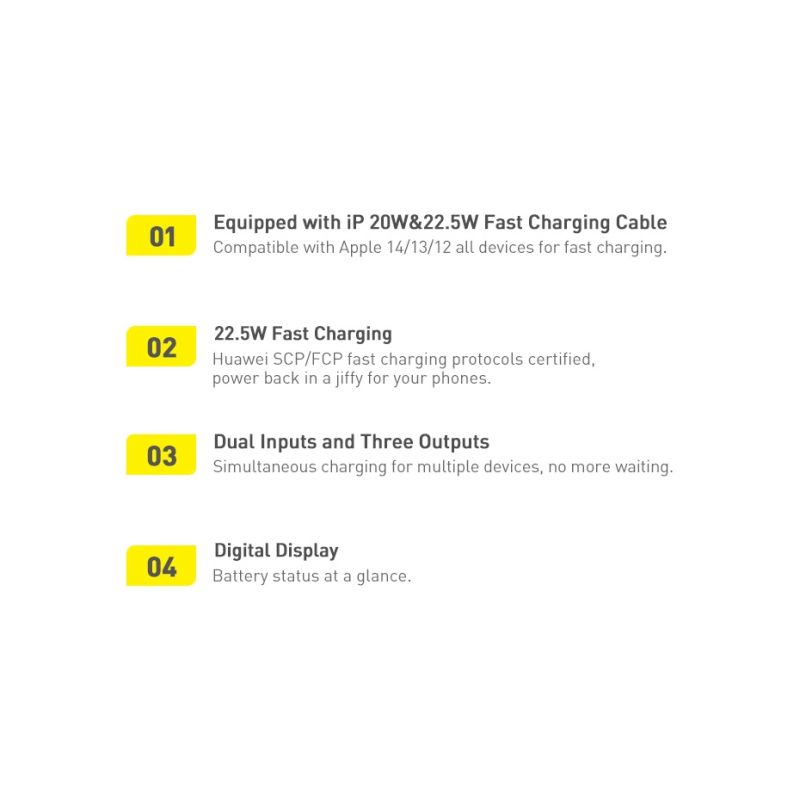 Powerbank unterstützt dank der verwendeten Technologie die Möglichkeit des schnellen Ladens von Geräten. Das bedeutet, dass Sie Ihr Telefon oder andere Geräte in nur wenigen Minuten aufladen können. Eine große Erleichterung ist auch der Einbau einer Digitalanzeige im Vorderteil. Mit seiner Hilfe können Sie bequem und schnell den Ladestand der Powerbank prüfen und diese bei Bedarf aufladen, bevor Sie das Haus verlassen.