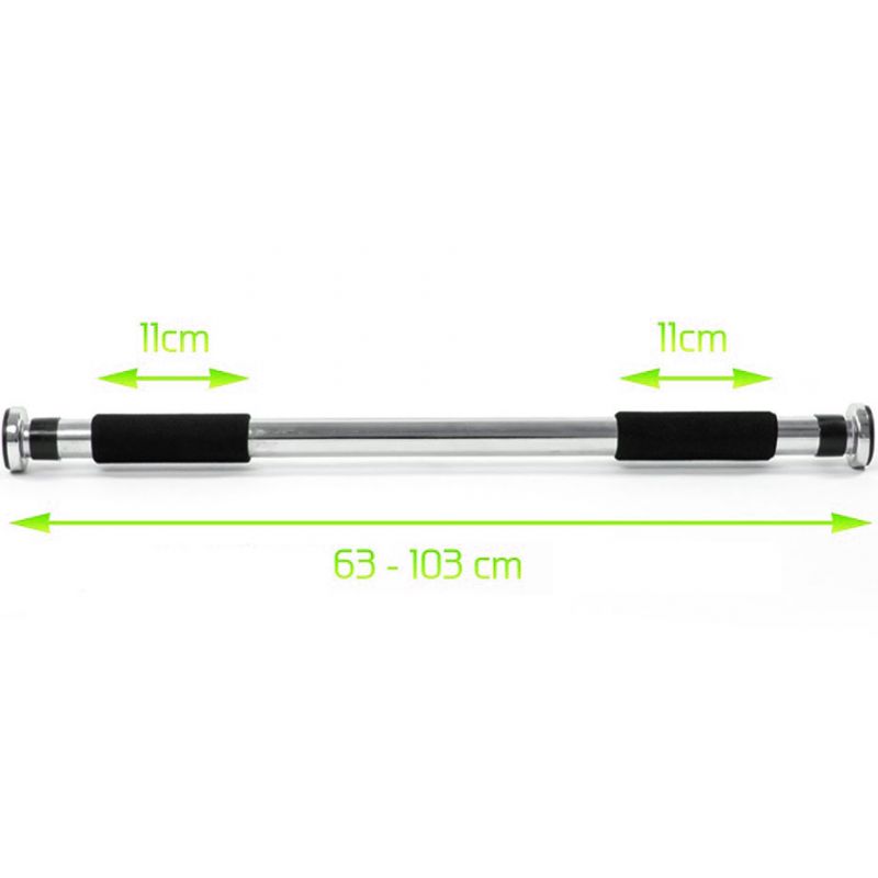 Diese hochwertige Klimmzugstange aus Stahl eignet sich perfekt für das Training zu Hause. Die schnelle und einfache Türmontage macht sie besonders praktisch. So trainieren Sie unkompliziert Rücken, Bauch, Oberschenkel, Bizeps und Trizeps. Dank der attraktiven Chromoberfläche fügt sie sich optisch in jeden Raum ein. Mit dieser Klimmzugstange verwandeln Sie im Handumdrehen einen normalen Türrahmen in eine Trainingsstation. Gummierte Enden sorgen dafür, dass das Gerät nicht vom Türrahmen rutscht. TECHNISCHE DATEN: Trainingsgerät für Arme, Bauch und Rückenmuskulatur. Längenverstellbar von 63 cm bis 103 cm. Maximale Belastung: 100 kg.