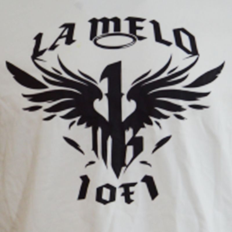 Die Bluse hat einen bequemen Rundhalsausschnitt und ist mit einem schwarzen „La melo“-Motiv auf der Brust verziert.