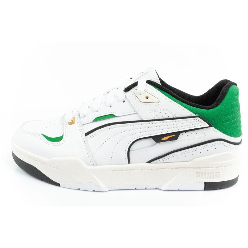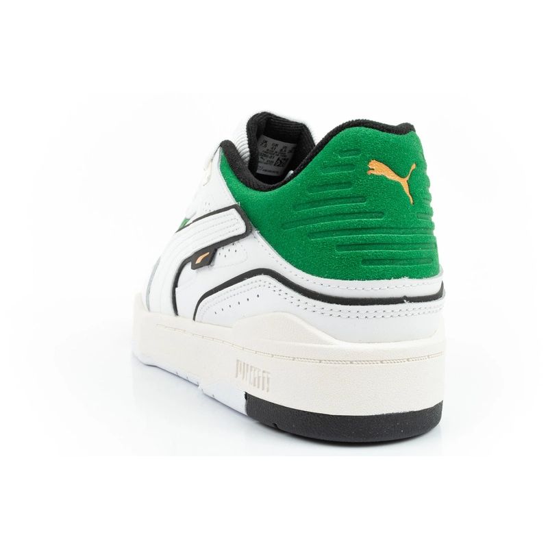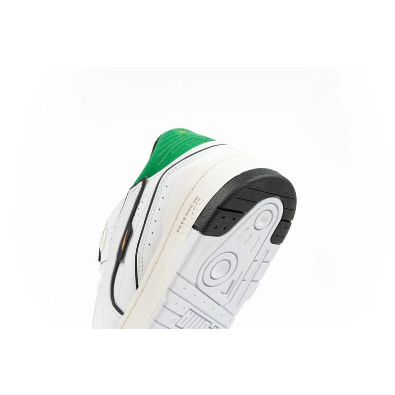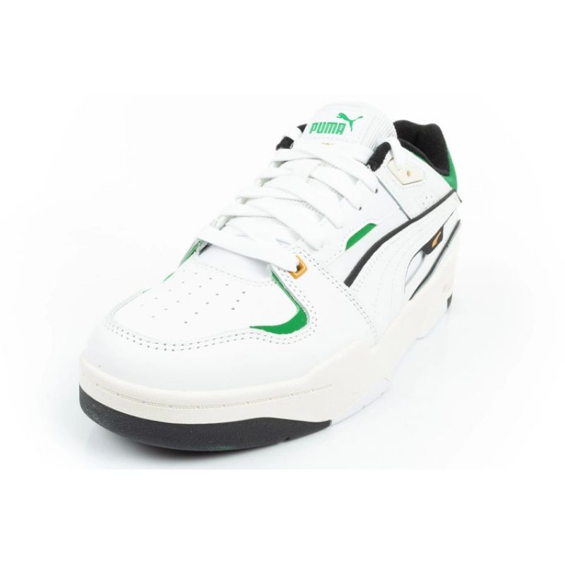 - Die weiße Silhouette wird an verschiedenen Stellen durch grüne Akzente unterbrochen. Der größte davon bedeckt die gesamte Ferse, auf der sich auch ein goldenes Puma-Logo befindet.