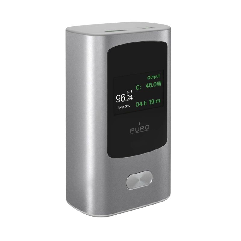 Mit ihrem schlanken, leichten Design in Grau vereint die Puro 45W Powerbank Eleganz und Praktikabilität auf perfekte Weise – ideal für Arbeit und Reisen.