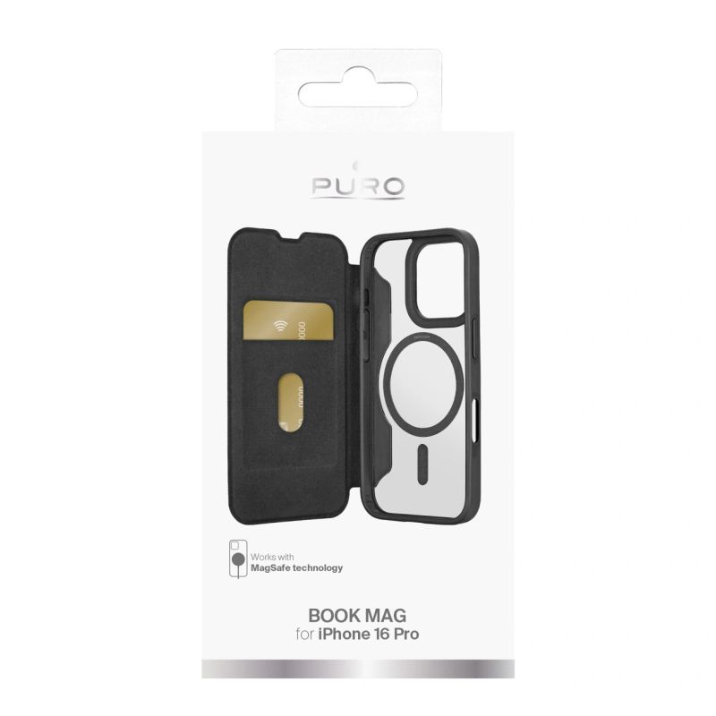 Puro Book Mag MagSafe Lederhülle mit Flip und Kartensteckplatz für iPhone 16 Pro – Schwarz