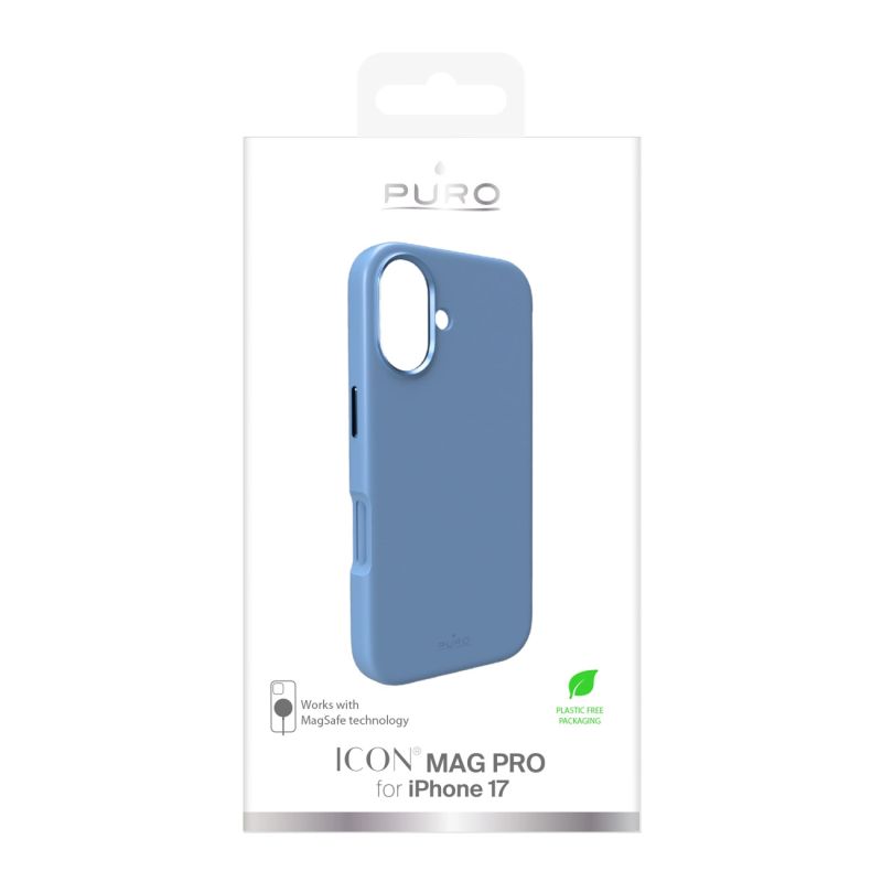 Puro Icon Mag Pro Silikonhülle für iPhone 17, MagSafe-kompatibel, mit Kameraschutz und Aluminiumknöpfen – Blau