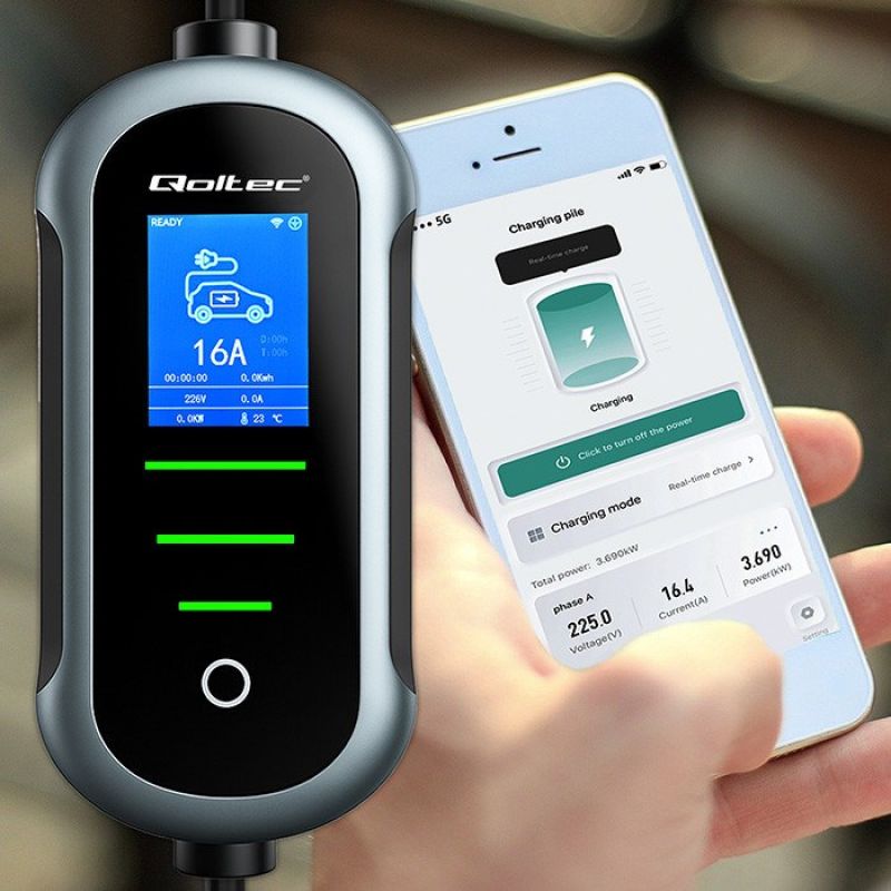 Qoltec Mobiles Ladegerät für Elektroautos (EV) mit 2-in-1-Anschluss Typ 2 | 3,5 kW | 230 V | SCHUKO 16 A | WLAN | TUYA | SMART LIFE | LCD | Tragbar | 5 m (52435)