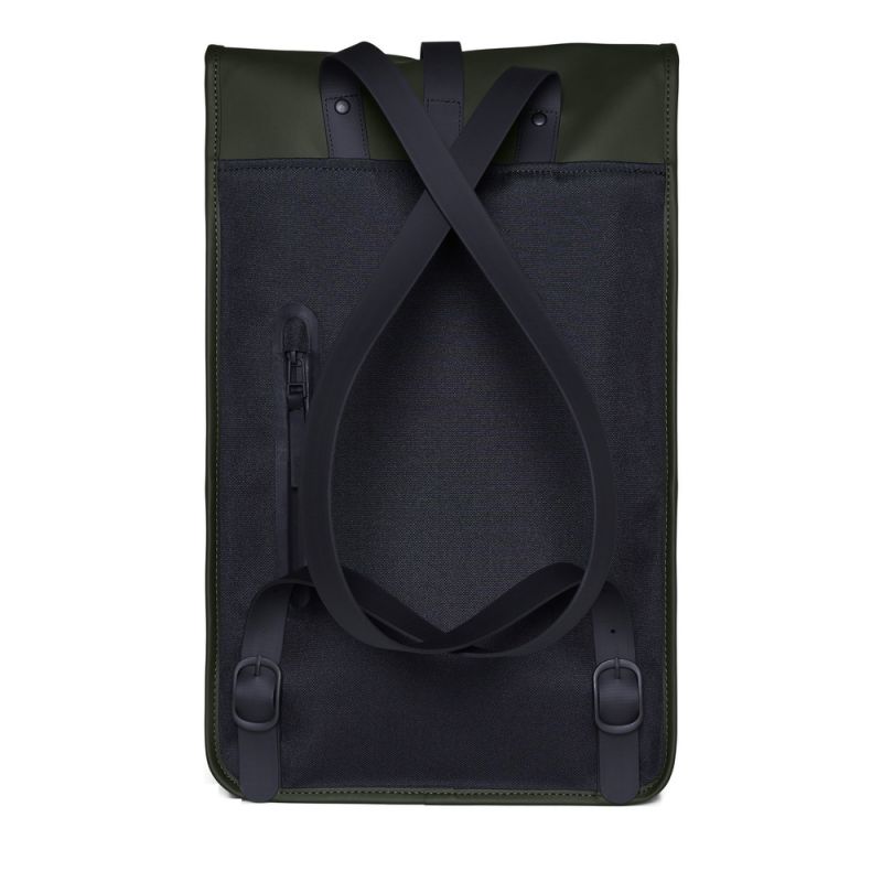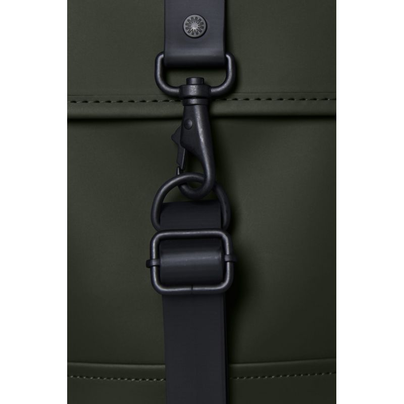 - Die Rucksack-Silhouette ist ein Rains-Klassiker mit einer markanten Klappe und einem zentralen Riemen mit Karabinerverschluss.